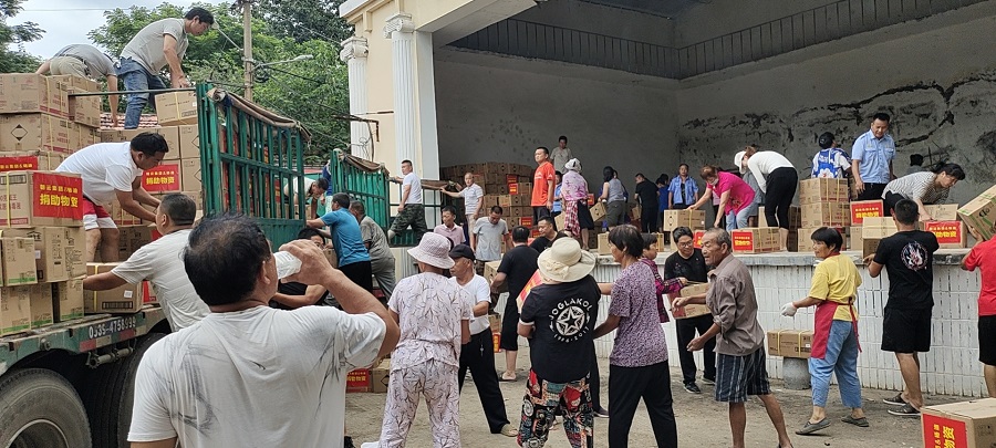 (当地志愿者和民众齐心协力搬运捐赠物资)
