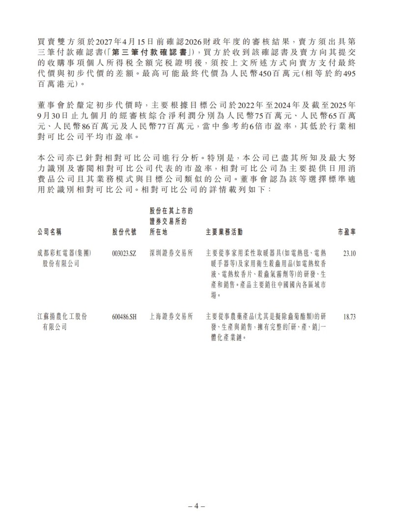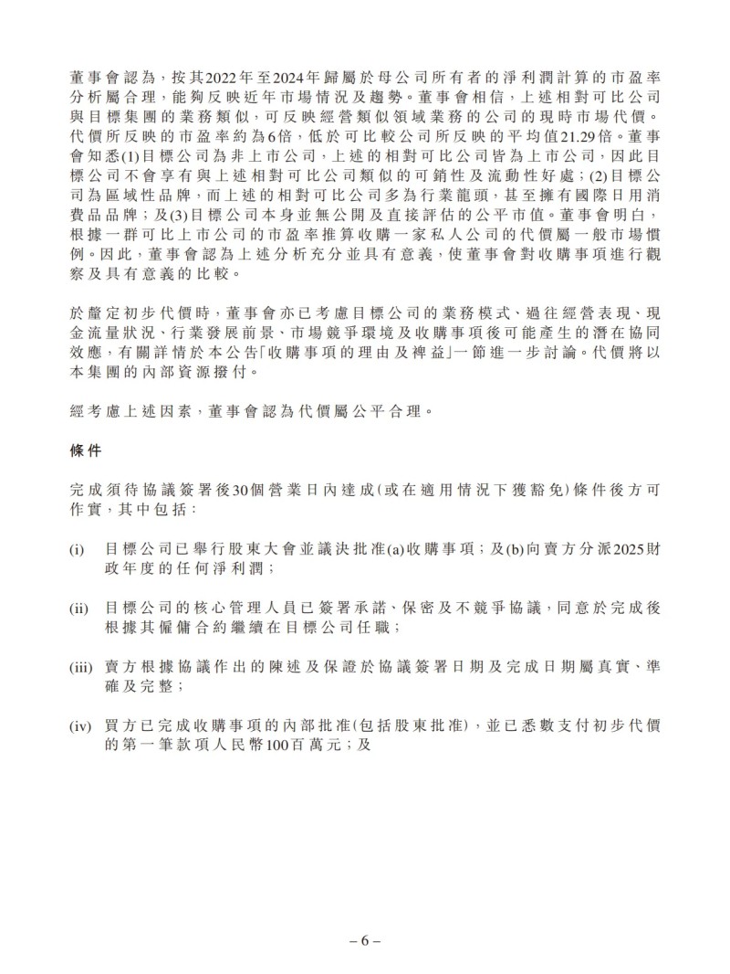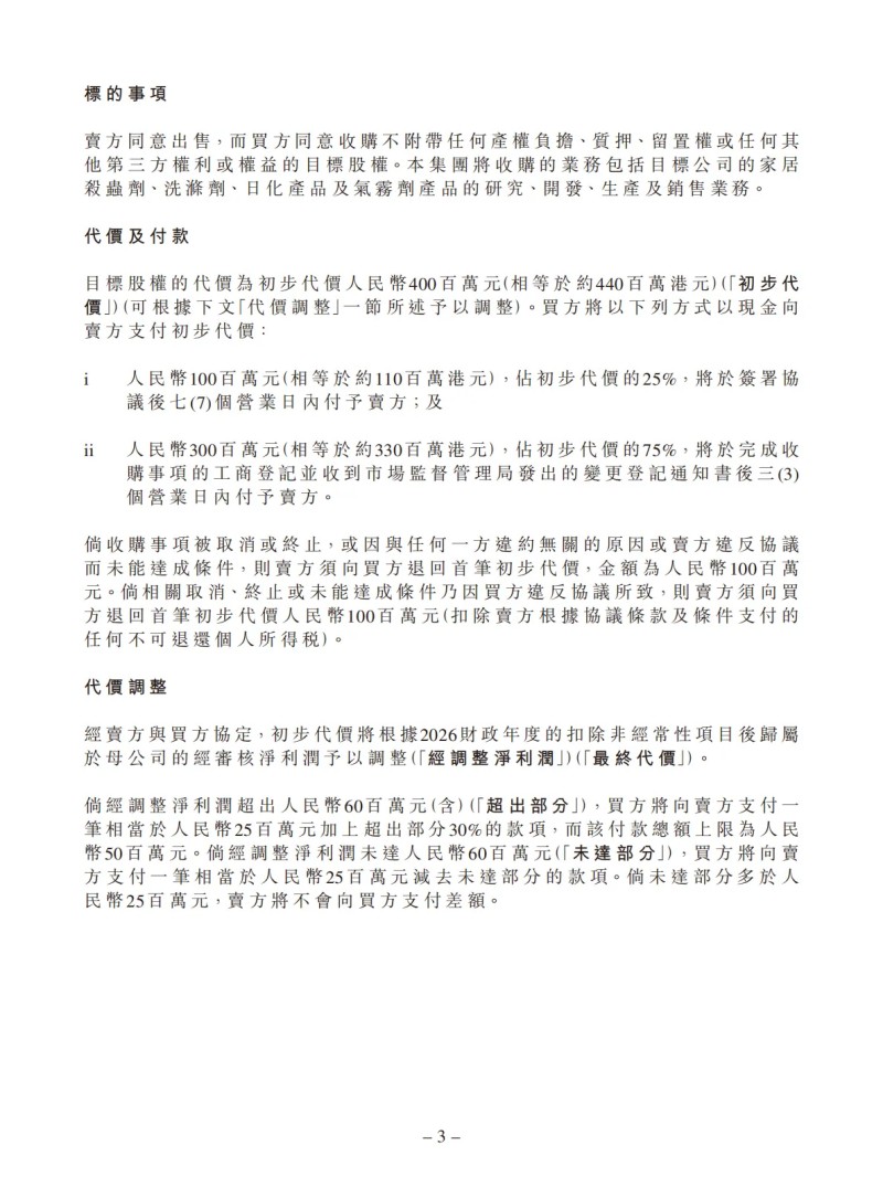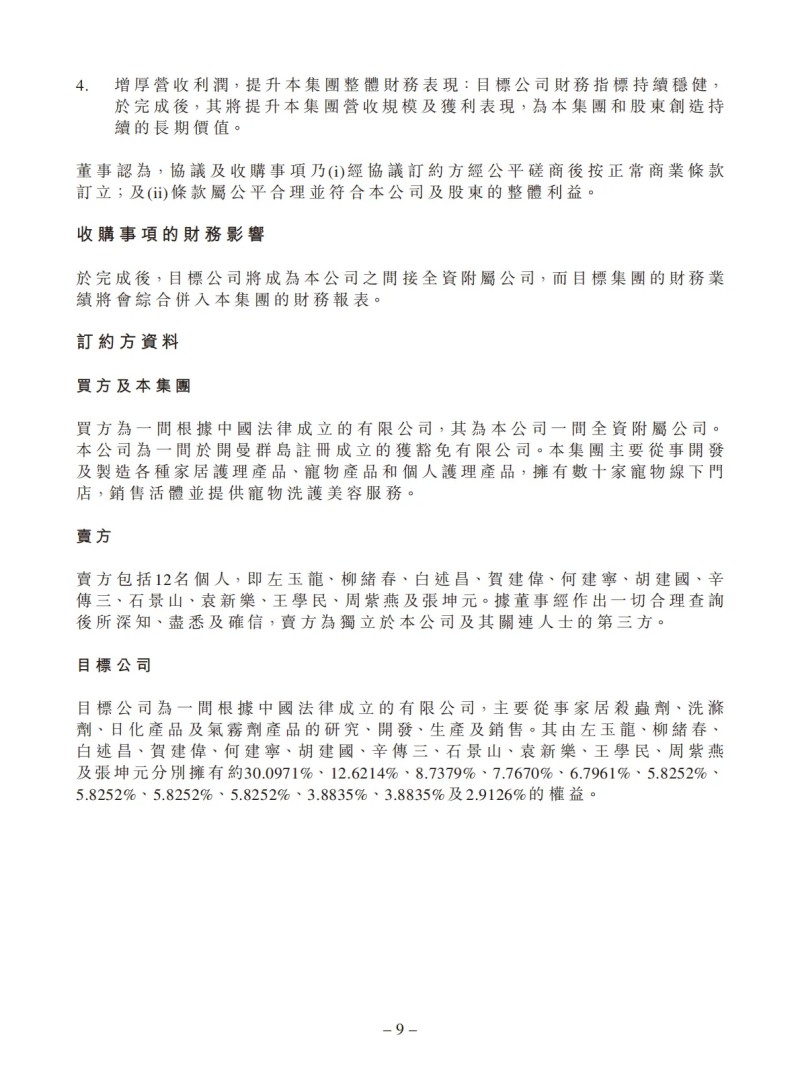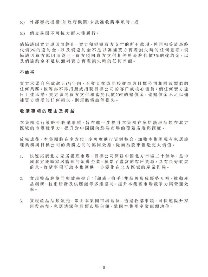 1、快速拓展北方家居护理市场:目标公司深耕中国北方市场三十余年,是中国北方地区家居护理的领导企业,积累了丰富的客户资源,具有良好发展前景。收购事项可助本集团进一步优化在北方区域的产业布局。