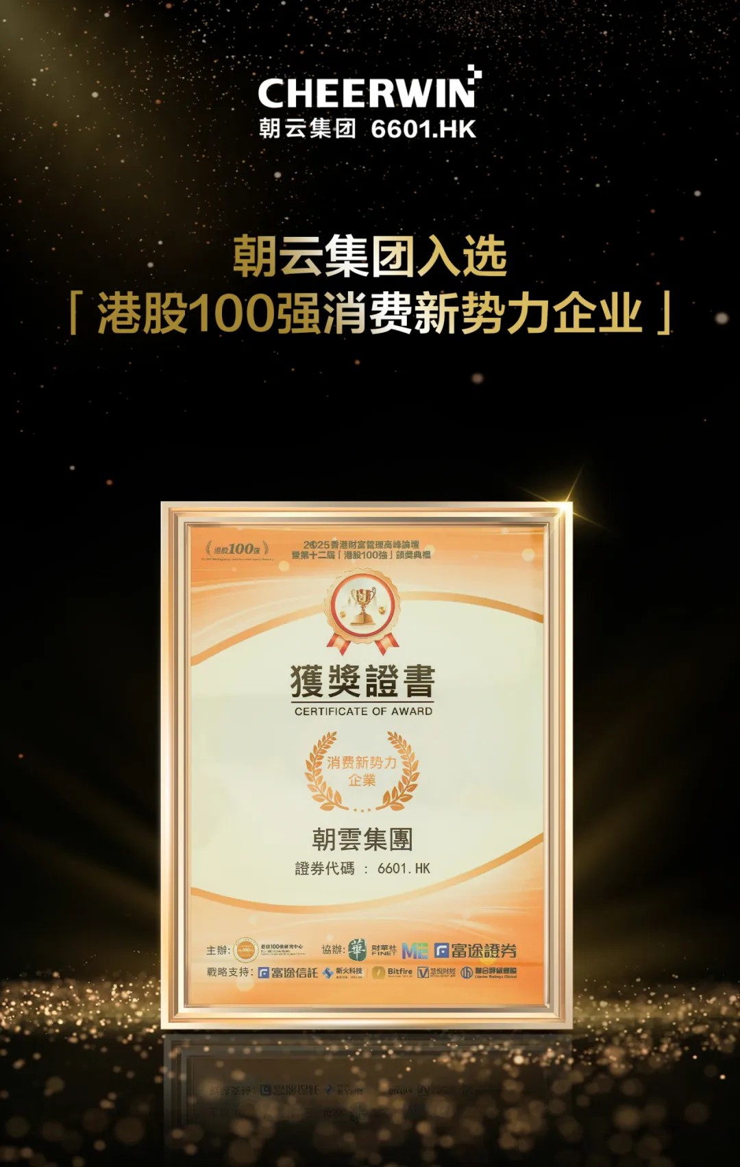 2026年1月9日,朝云集团在第十二届「港股100强」颁奖典礼上,凭借在财务稳健性、消费赛道成长性、投资者关注度及市场流动性等方面的综合表现,入选「港股100强 x 富途证券」联合榜单,并获颁“消费新势力企业”奖项。