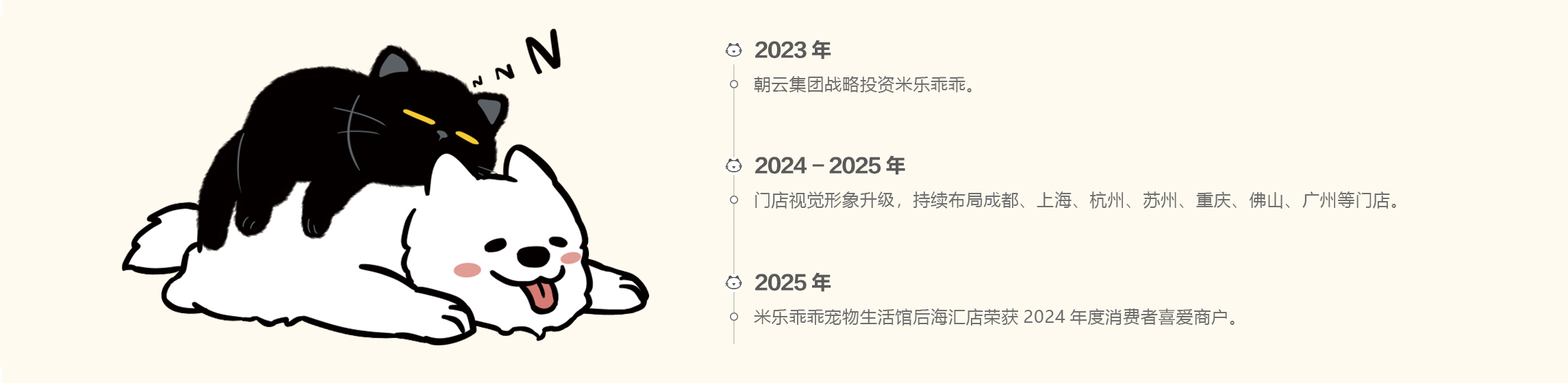 米乐乖乖宠物生活馆成立于2019年,是全国大型宠物综合连锁店,于2023年9月获上市公司朝云集团(6601.HK)战略投资。